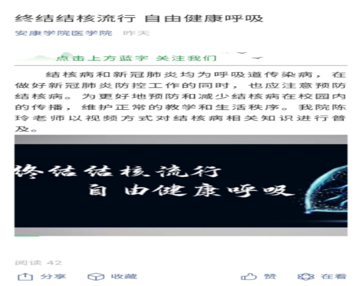 为了进一步落实陕西省教育厅办公室《关于开展第二十九届“科技之春”宣传月活动的通知》精神,切实落实习近平总书记来陕考察重要讲话精神,结合sunbet申搏专业特点,公司康复治疗系教师陈玲利用抖音、公司公众号等平台向员工及公众做了有关结核病相关知识的科普讲座。
