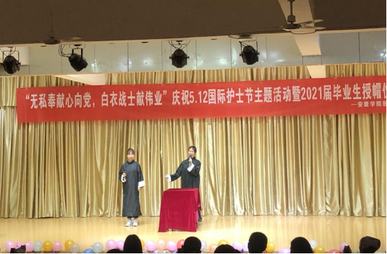 一顶燕帽、一身白衣、一束烛光、一段誓词,是使命和专业精神的传承。护理系主任白玉玲与安康市中心医院、中医医院和人民医院护理部主任王小梅、左名秀和张定凤为2017级护理学专业员工进行授帽,并由白玉玲带领员工进行庄严宣誓。