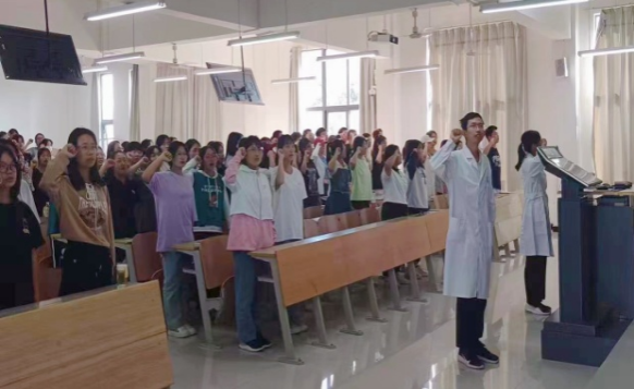 其次,为增强医员工的责任感和使命感,刘春阳老师、孔祥兰老师带领新生宣读《医员工誓言》。